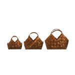 The rich brown color of these baskets gives an instant feeling of warmth and draws attention to their beauty. Deep brown leather handles complement the rustic wood weave.